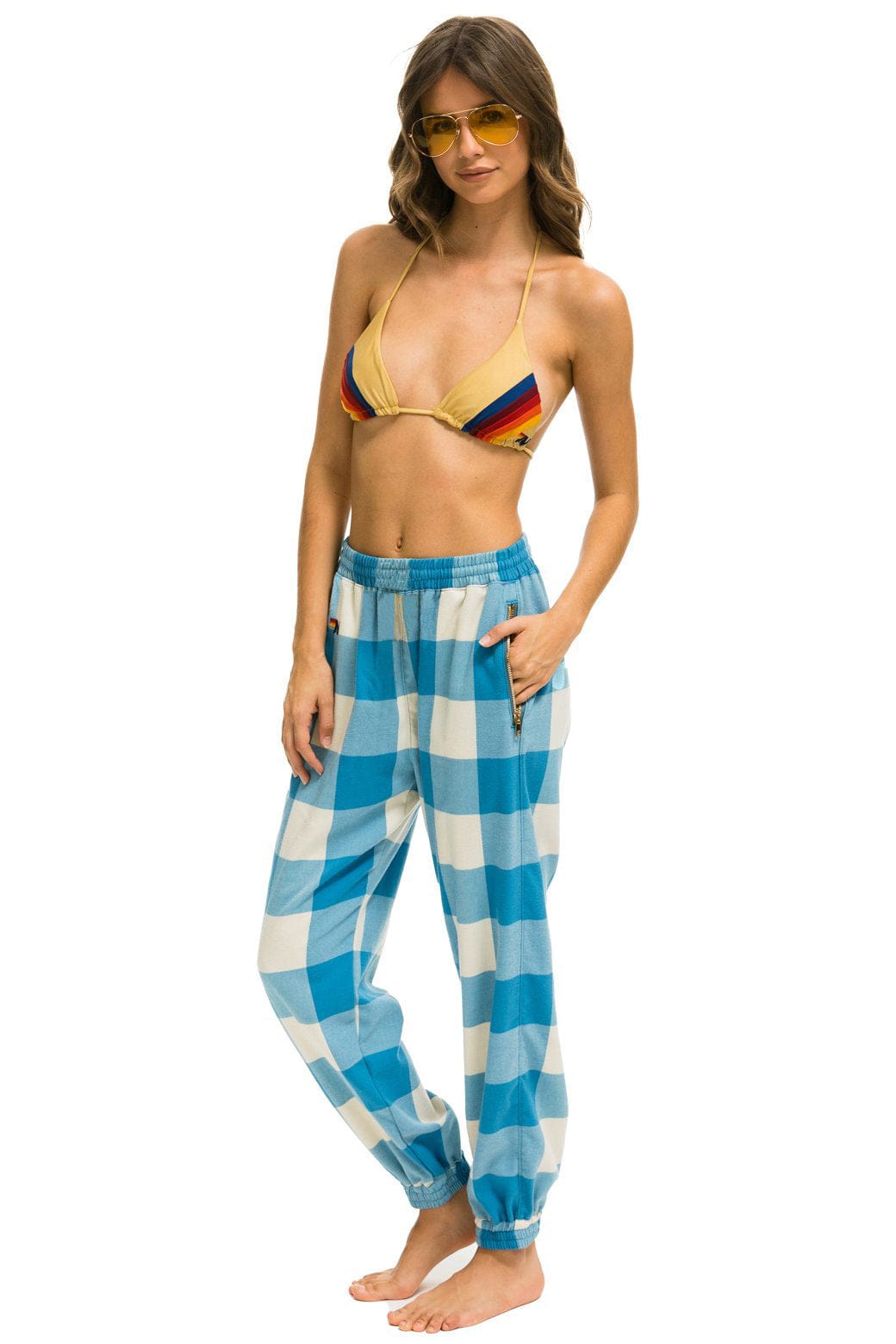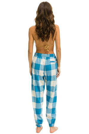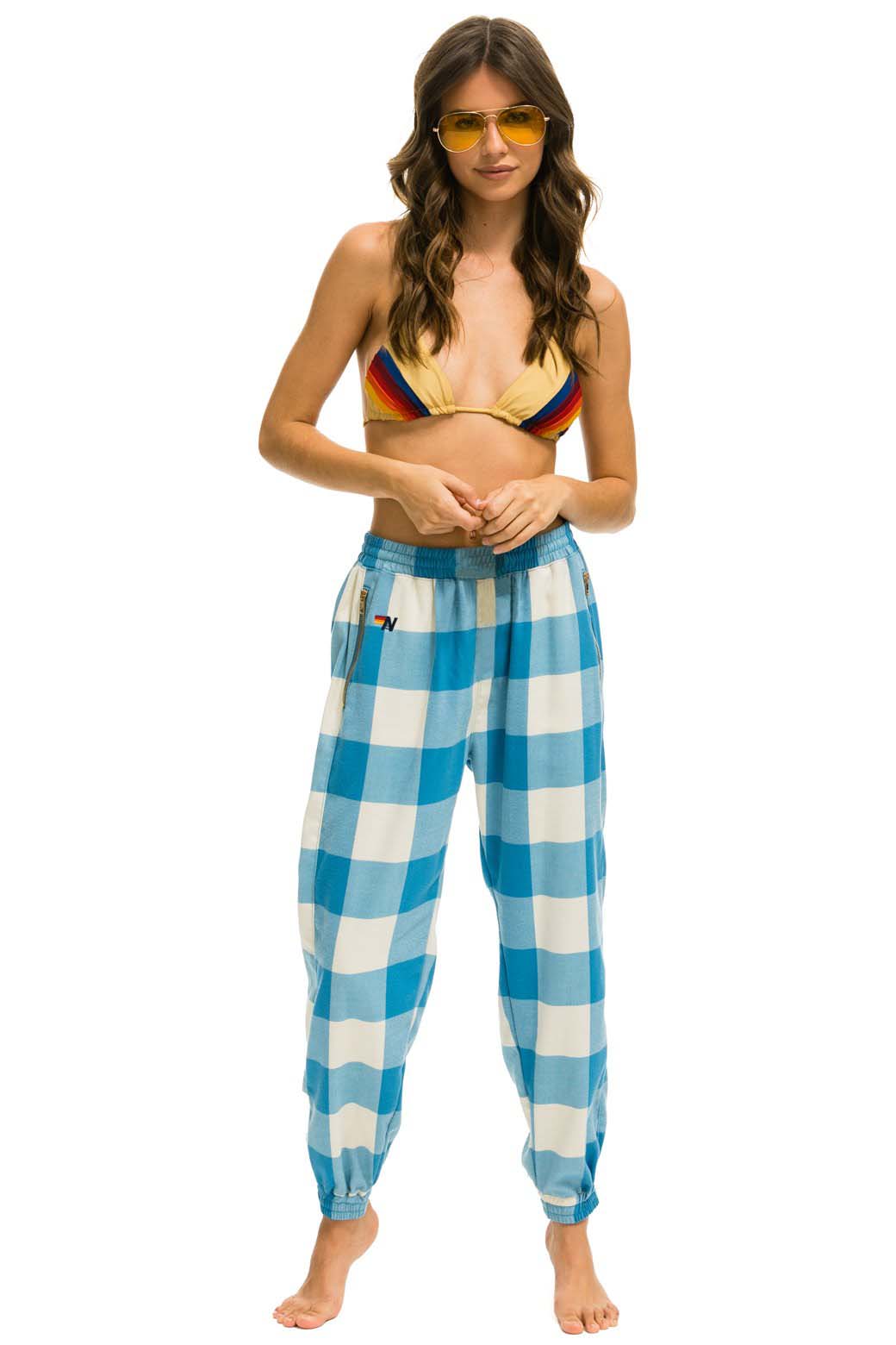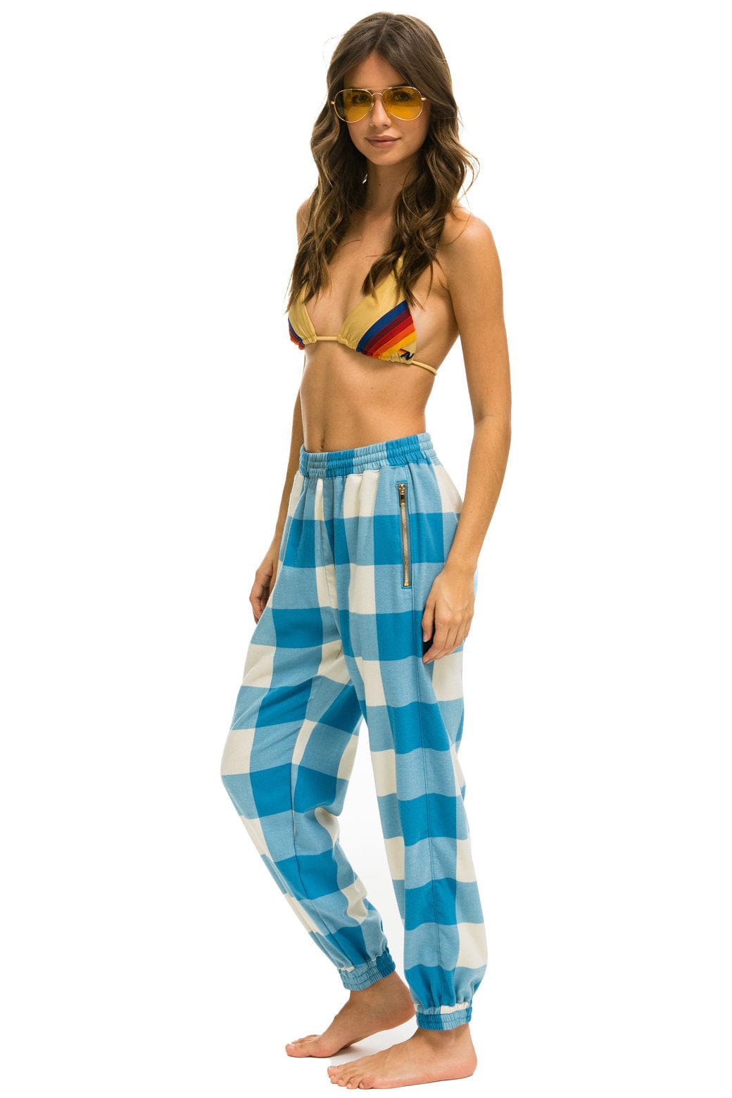 Aviator Nation has combined two of their favorite things - their laidback jogger style pant and incredibly cozy fabrics - into this upscale and retro style track pant. Using our one of kind plaid patterns from the season, you will be sure to make a statement wherever you go. Design details include our signature exposed gold zippers for the front hand pockets, a drawcord and even a back pocket for all your safe keepings. Our fabric has a hint of stretch for ease of movement as well as a slight brush effect giving it that extra soft touch. There are even matching jackets if you are ready to run a head to toe kit.