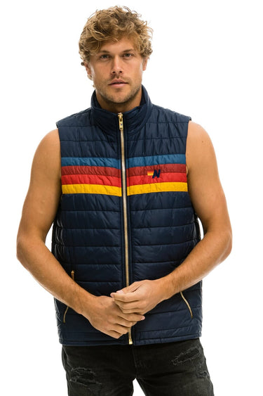 MEN'S 4 STRIPE VEST - NAVY+LOGO SOCK - WHITE+LOGO RAINBOW VINTAGE TRUCKER HAT