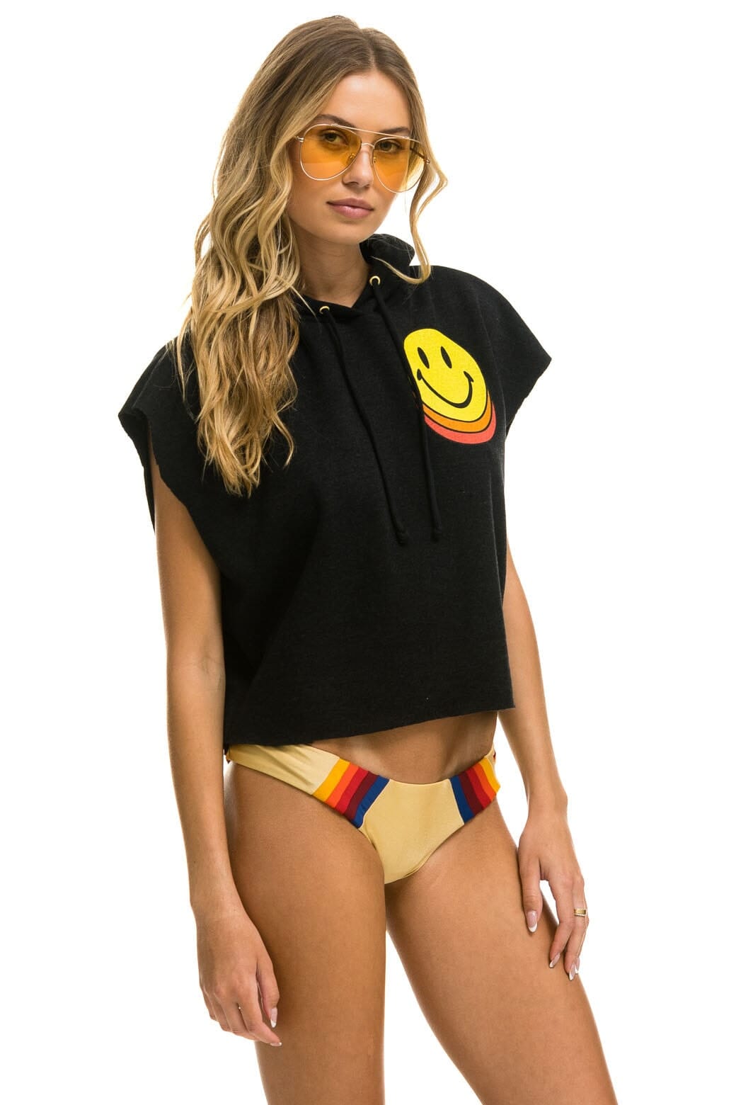 SMILEY SUNSET SLEEVELESS RELAXED CROPPED PULLOVER HOODIE - BLACK+LOGO SOCK - WHITE+LOGO RAINBOW VINTAGE TRUCKER HAT
