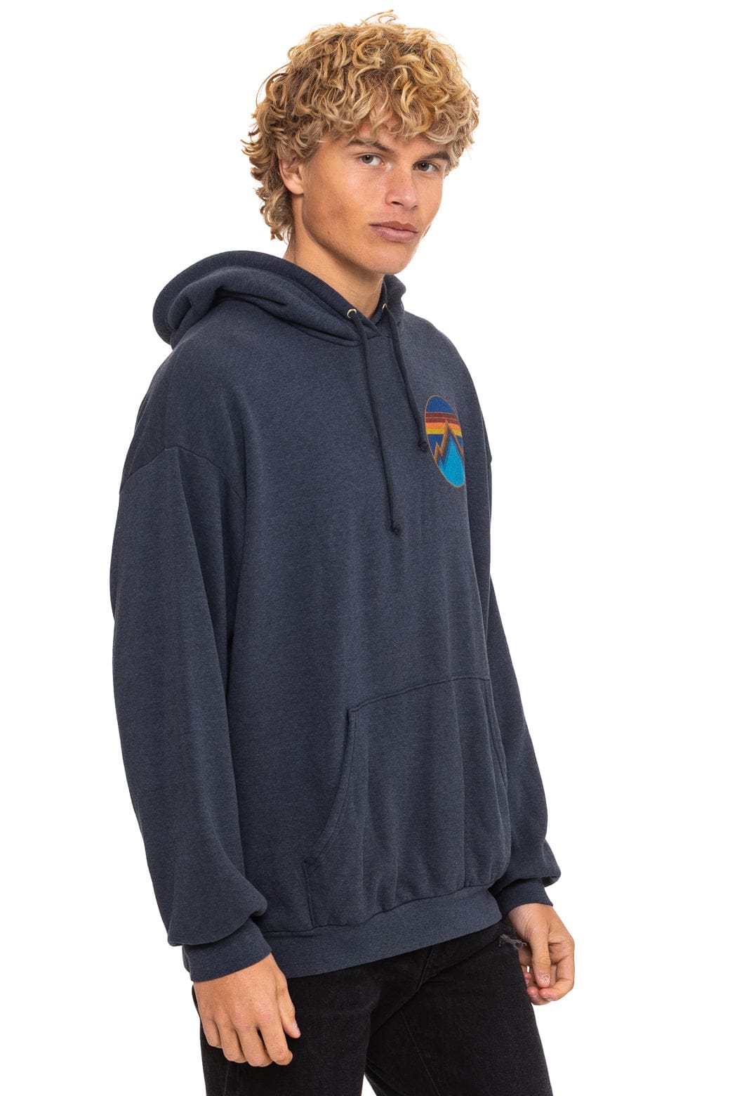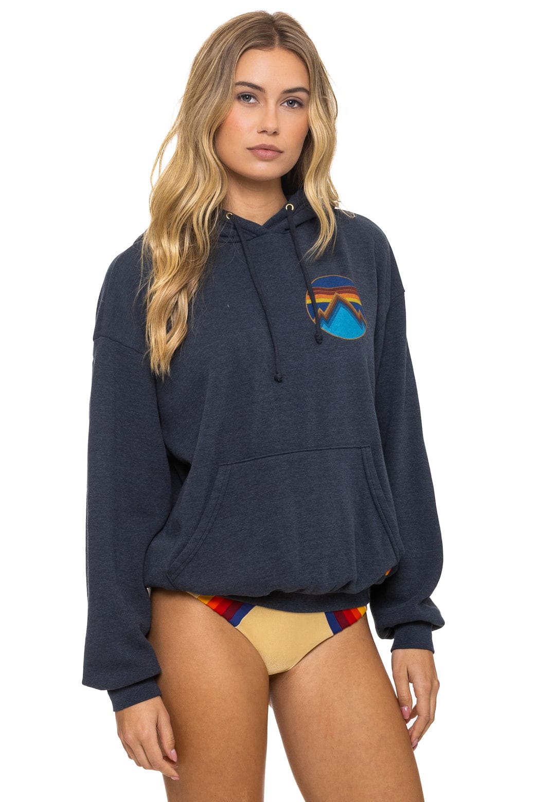 Our relaxed fit hoodie is UNISEX.  Runs oversized. Female model is 5'8" wearing XS. Male model is 6'0" wearing size L.  Size down for traditional fit.