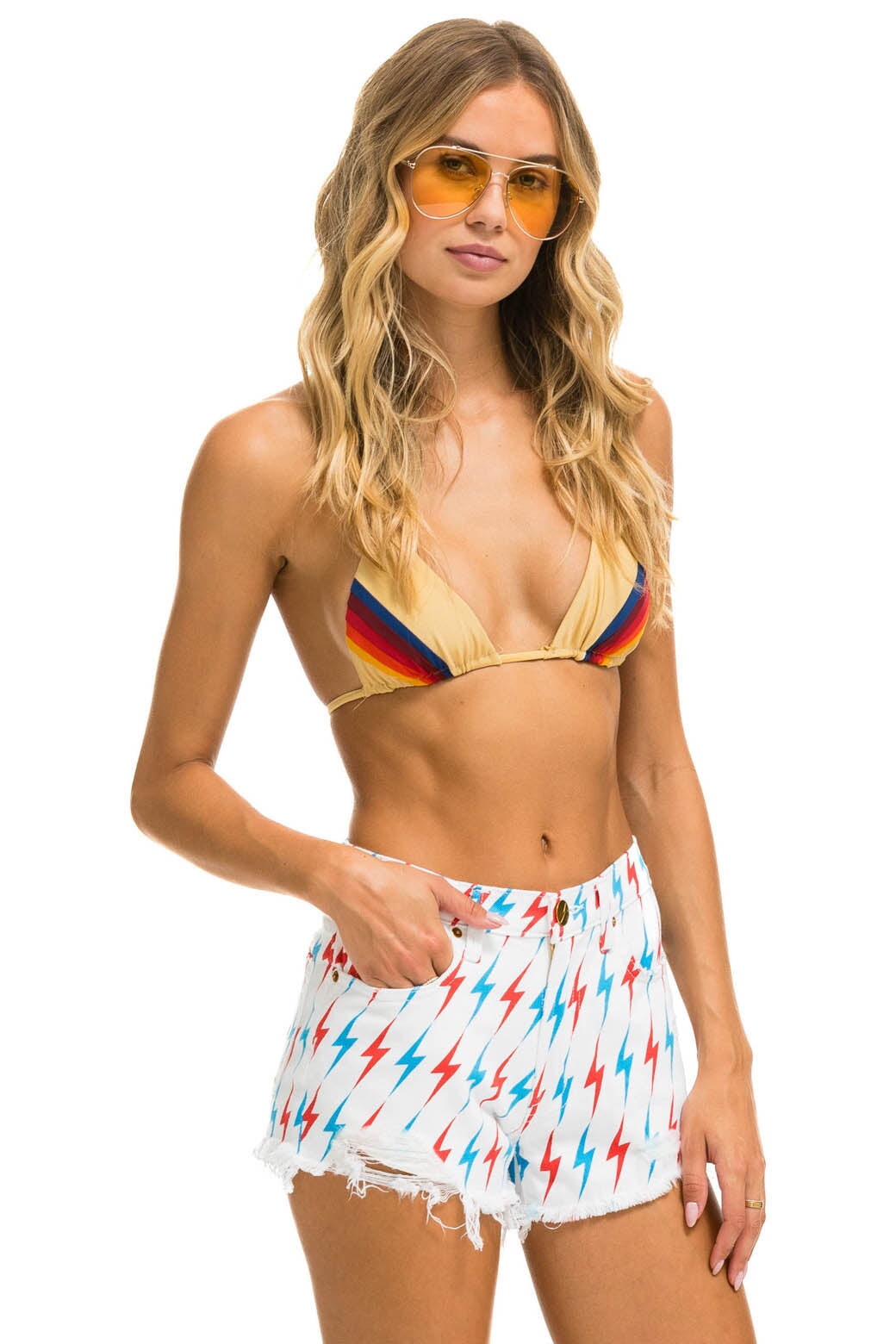 AVIATOR BOLT BOYFRIEND CUTOFF JEAN SHORTS - WHITE+LOGO SOCK - WHITE+LOGO RAINBOW VINTAGE TRUCKER HAT
