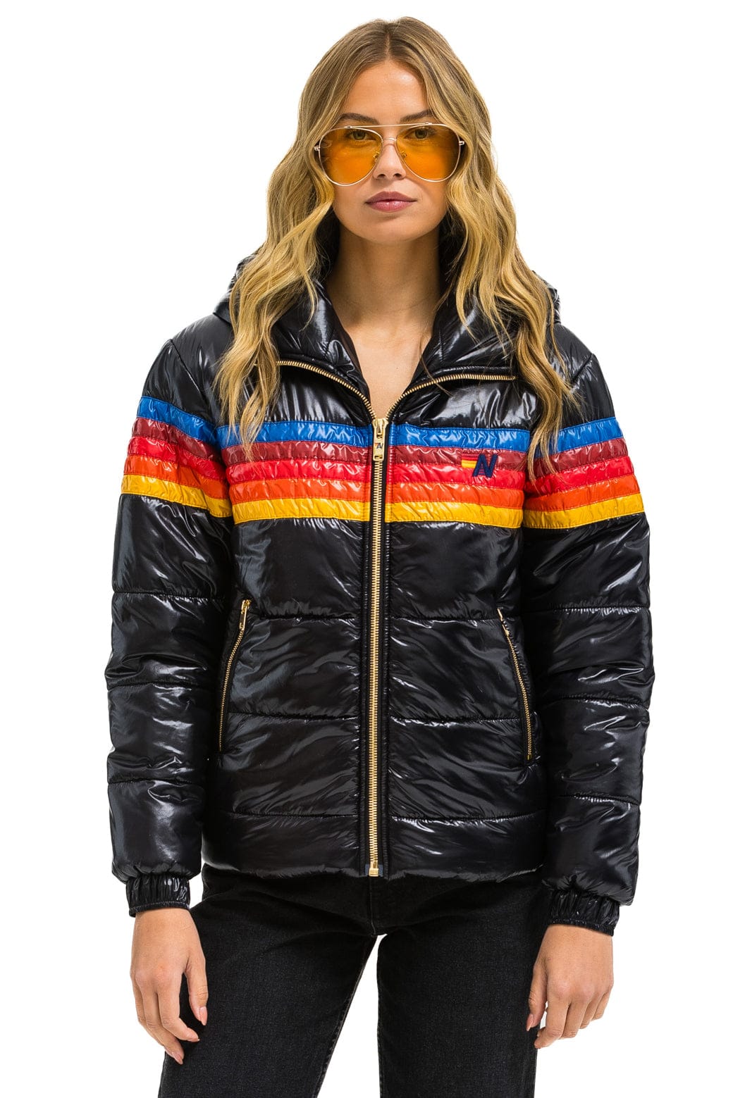 5 STRIPE TREKKER JACKET - GLOSSY BLACK+LOGO SOCK - WHITE+LOGO RAINBOW VINTAGE TRUCKER HAT
