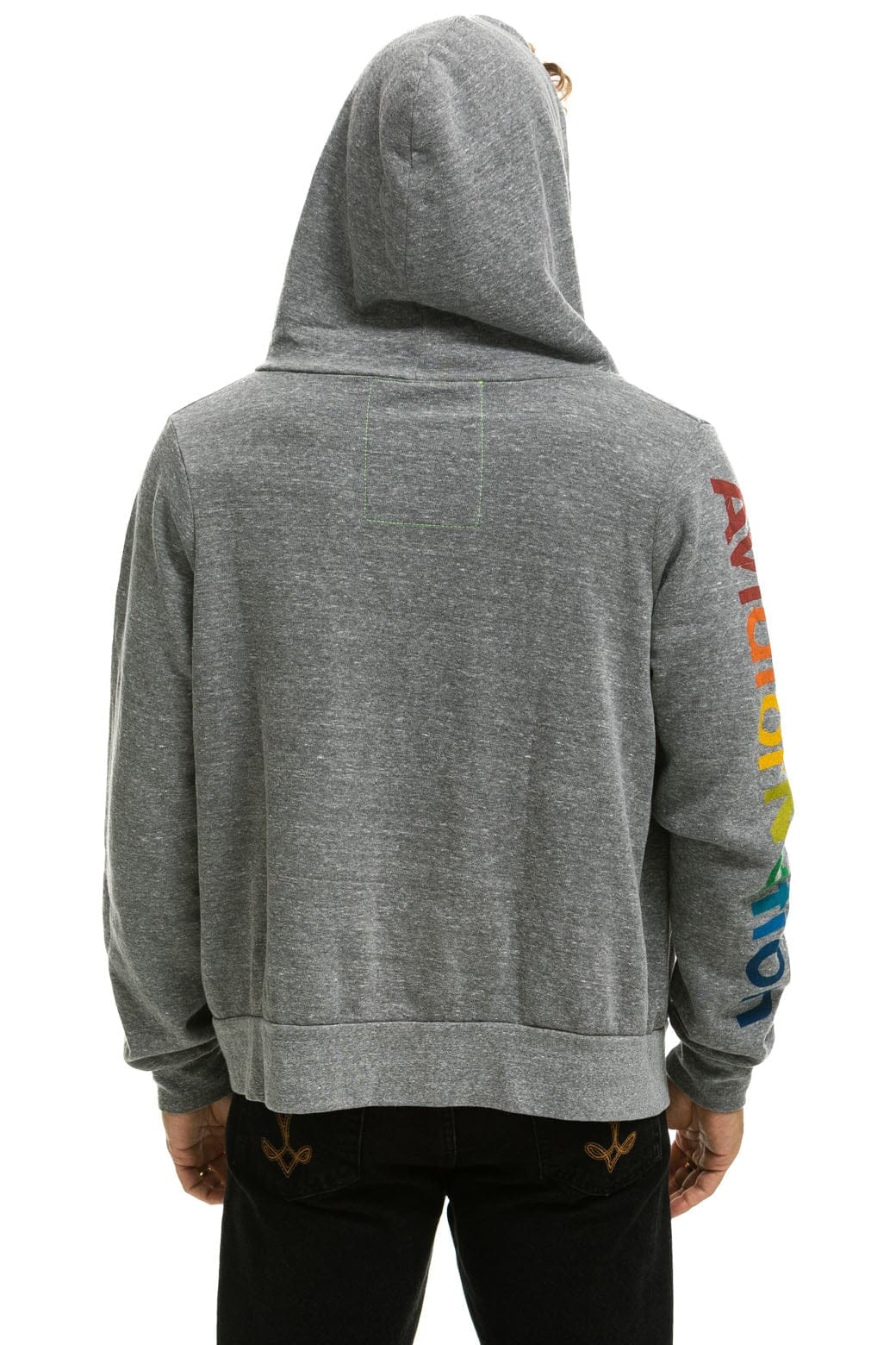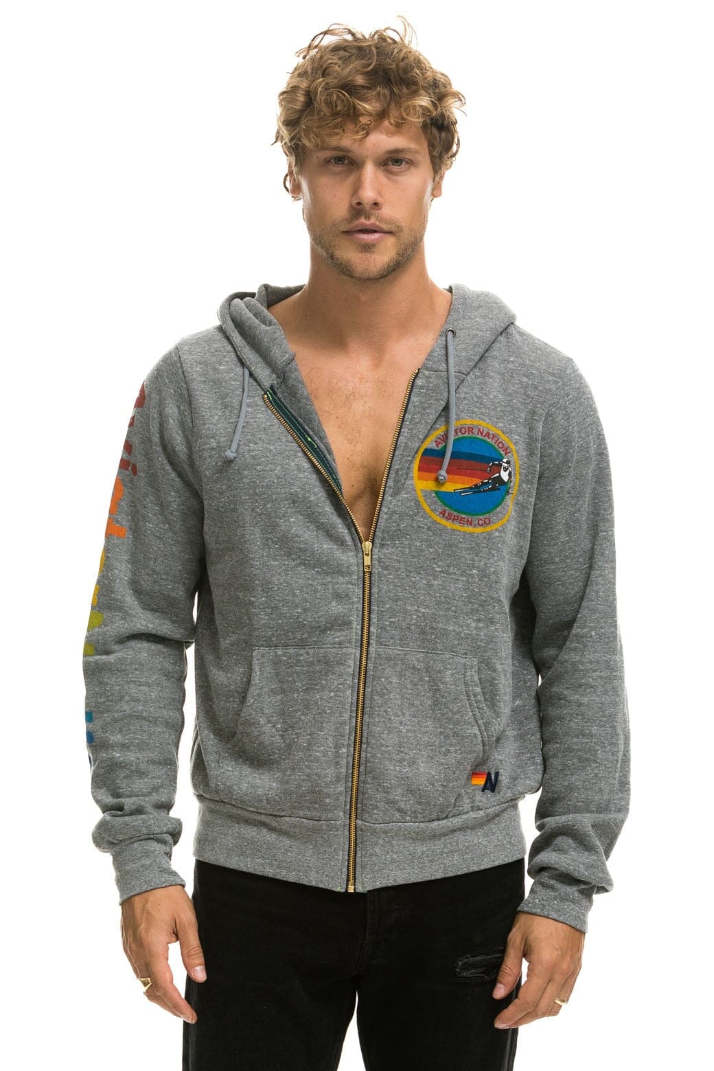 AVIATOR NATION ASPEN HOODIE - HEATHER GREY+LOGO SOCK - WHITE+LOGO RAINBOW VINTAGE TRUCKER HAT