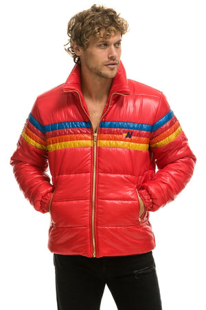 4 STRIPE LUXE TRAVELER JACKET - GLOSSY CHERRY+LOGO SOCK - WHITE+LOGO RAINBOW VINTAGE TRUCKER HAT
