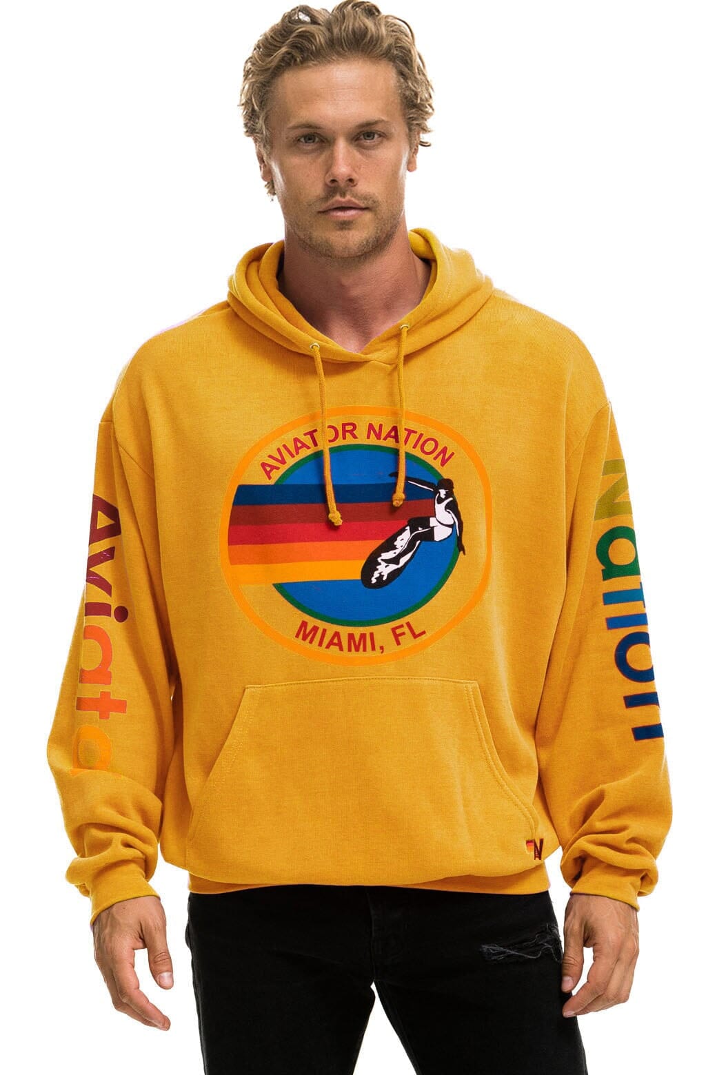 AVIATOR NATION MIAMI RELAXED PULLOVER HOODIE - GOLD+LOGO SOCK - WHITE+LOGO RAINBOW VINTAGE TRUCKER HAT
