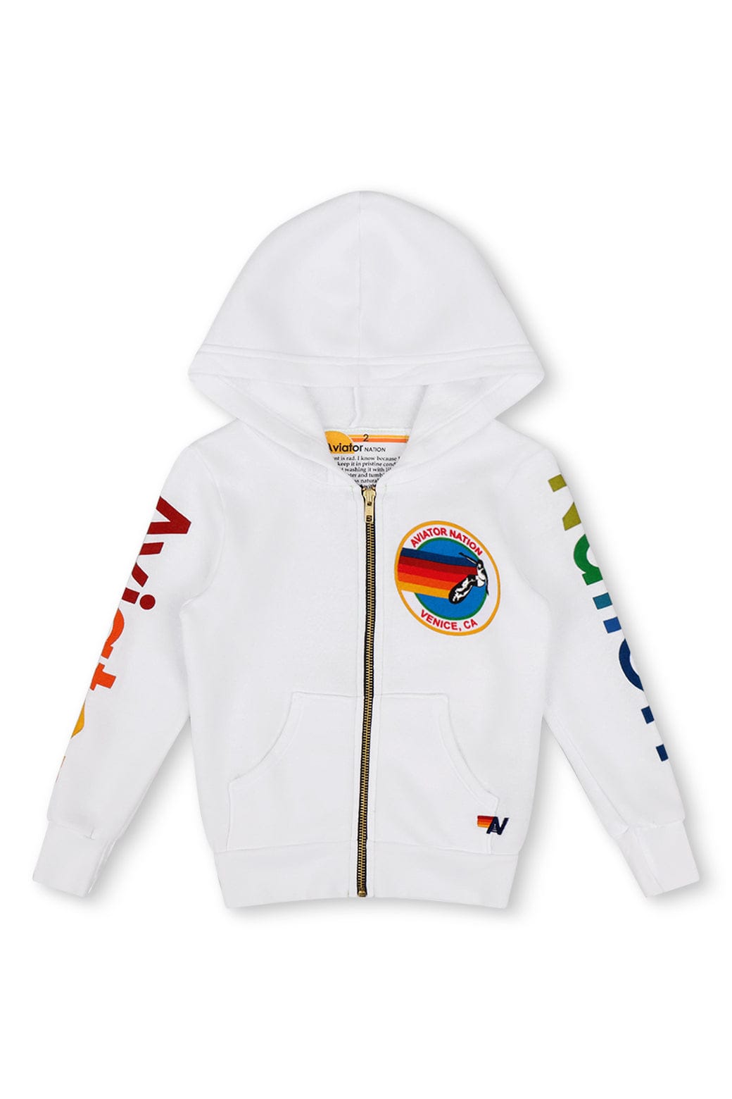 KID'S AVIATOR NATION ZIP HOODIE - WHITE+LOGO SOCK - WHITE+LOGO RAINBOW VINTAGE TRUCKER HAT