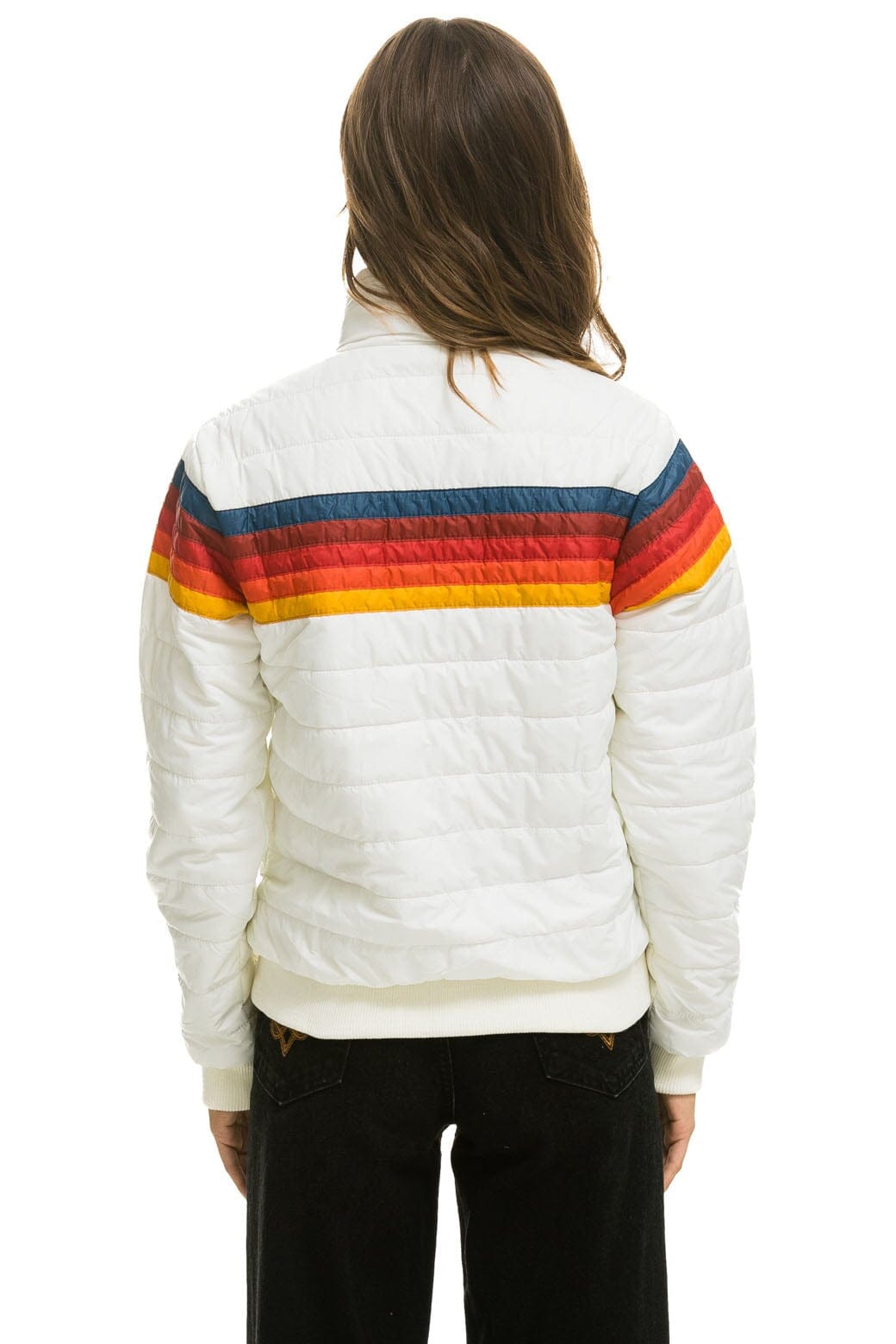 Our latest 60gm 5 stripe jacket is the new super light version of the original. This jacket is a great layering piece for all conditions. We recommend it for concerts, hikes, post surf sesh, travel, sunsets, sunrises, morning coffee with friends, dune buggy excursions and long walks with your dog. You can sleep in it, eat in it, make out in it or even use it as a pillow if you get locked out of your house. This jacket is extremely comfortable, breathable, warm and packable enough to stuff in your backpack or purse. The exterior is our legendary, super soft and durable nylon with a coat of water repellent just in case you get caught in a storm. The insulation is Primaloft gold 60gm to keep you warm without weighing you down. Get ready to turn heads everywhere you go.