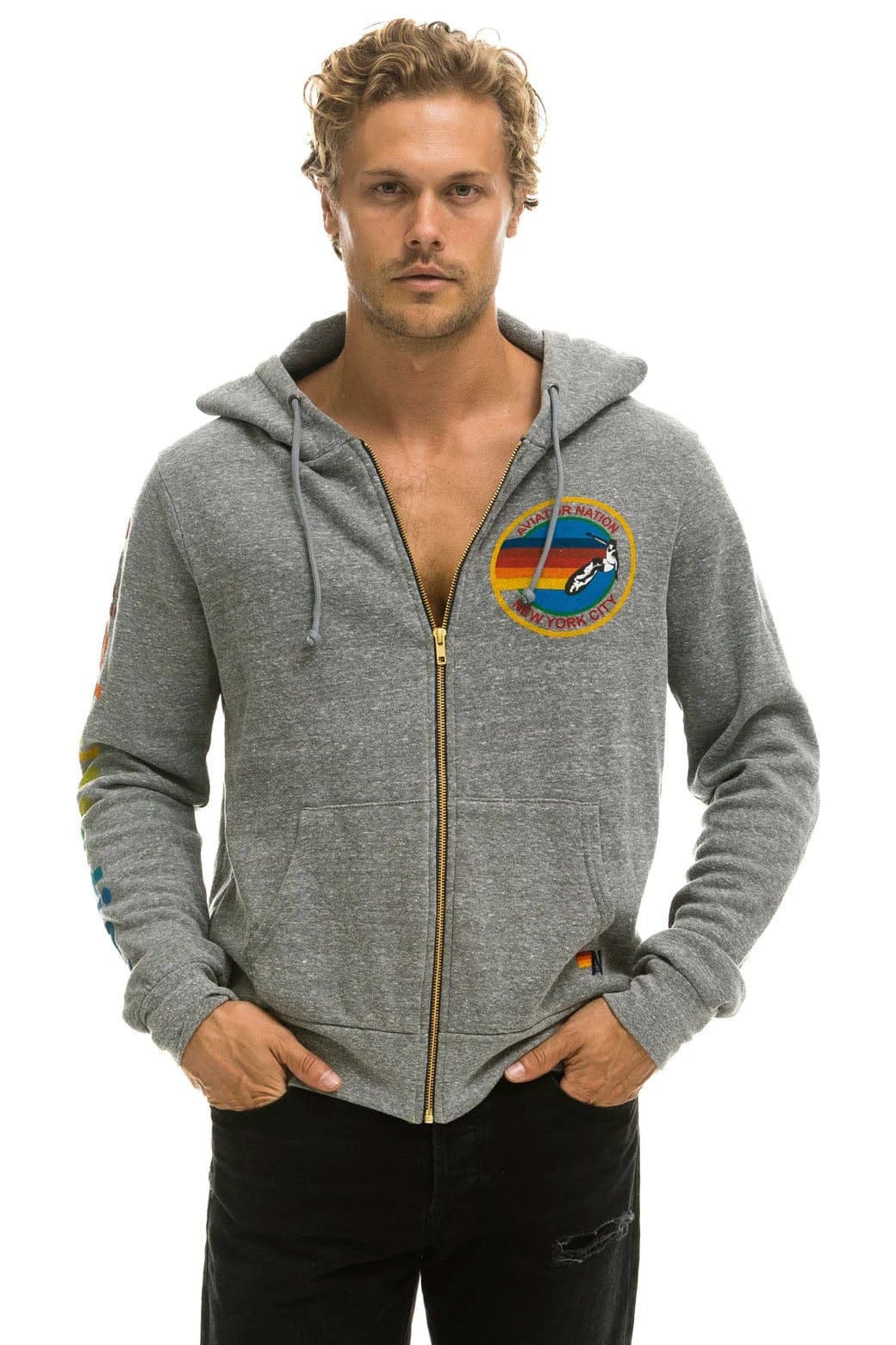 AVIATOR NATION NEW YORK CITY HOODIE - HEATHER GREY+LOGO SOCK - WHITE+LOGO RAINBOW VINTAGE TRUCKER HAT