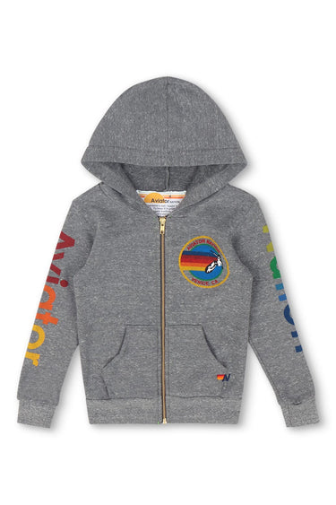 KID'S AVIATOR NATION ZIP HOODIE - HEATHER GREY+LOGO SOCK - WHITE+LOGO RAINBOW VINTAGE TRUCKER HAT