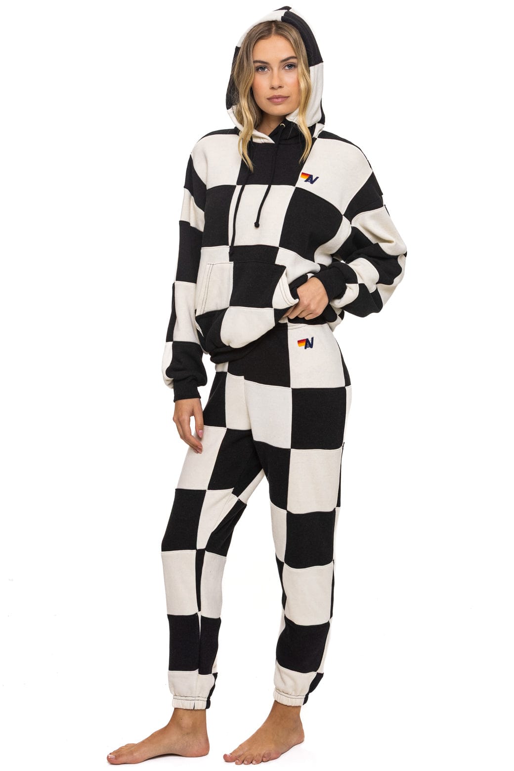 CHECK QUILT RELAXED PULLOVER HOODIE - VINTAGE WHITE // BLACK+LOGO SOCK - WHITE+LOGO RAINBOW VINTAGE TRUCKER HAT