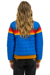 Our latest 60gm 5 stripe jacket is the new super light version of the original. This jacket is a great layering piece for all conditions. We recommend it for concerts, hikes, post surf sesh, travel, sunsets, sunrises, morning coffee with friends, dune buggy excursions and long walks with your dog. You can sleep in it, eat in it, make out in it or even use it as a pillow if you get locked out of your house. This jacket is extremely comfortable, breathable, warm and packable enough to stuff in your backpack or purse. The exterior is our legendary, super soft and durable nylon with a coat of water repellent just in case you get caught in a storm. The insulation is Primaloft gold 60gm to keep you warm without weighing you down. Get ready to turn heads everywhere you go.