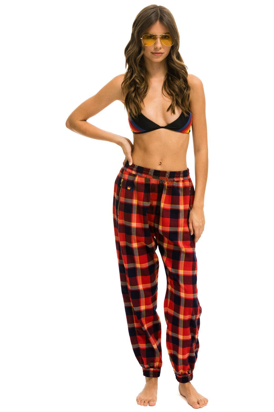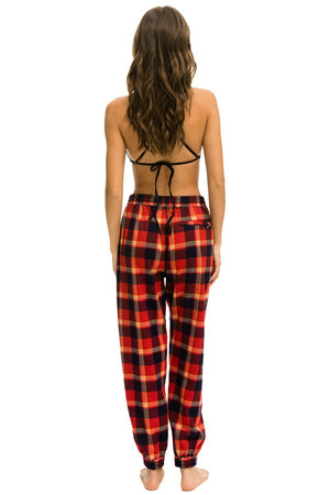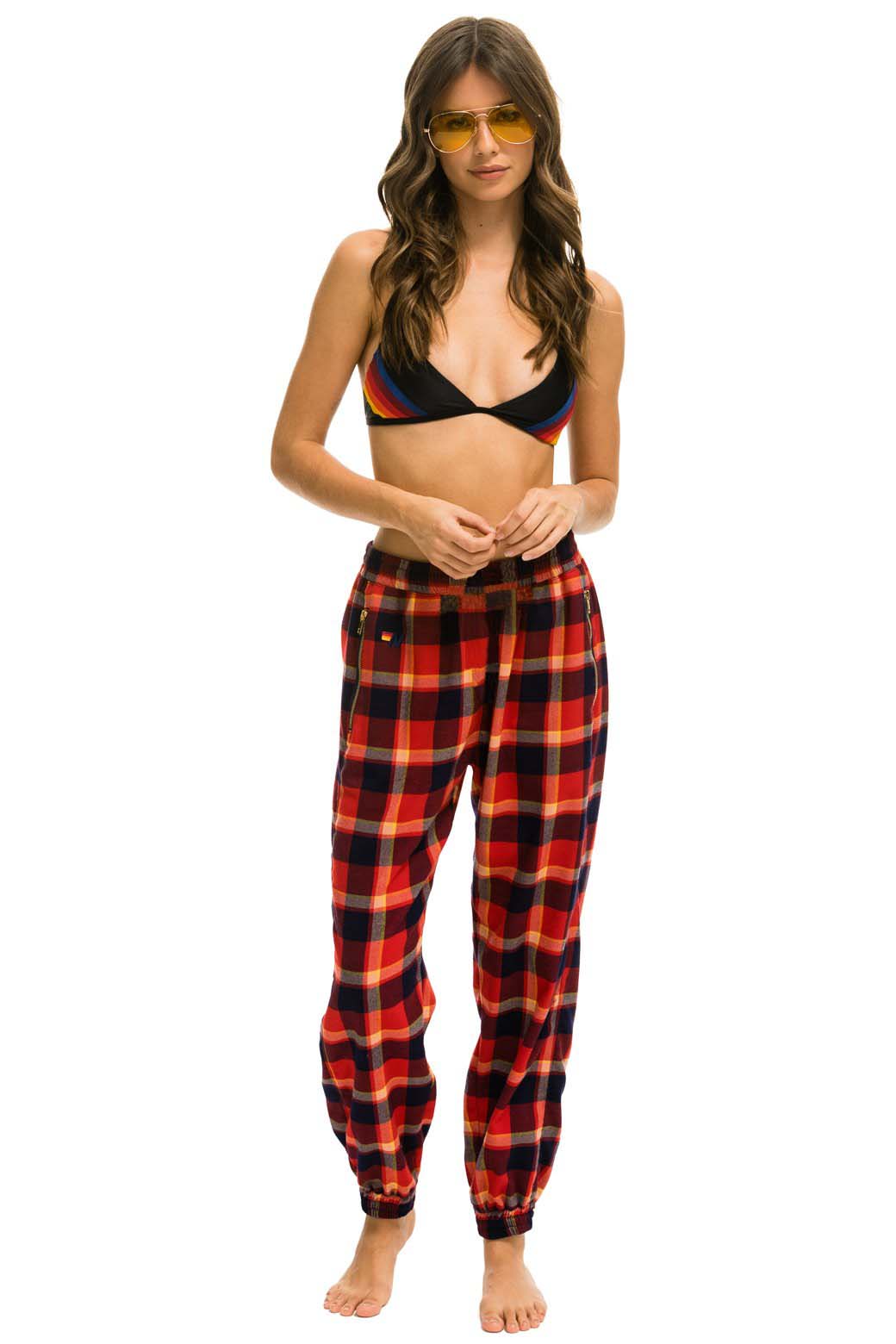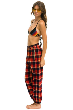 Aviator Nation has combined two of their favorite things - their laidback jogger style pant and incredibly cozy fabrics - into this upscale and retro style track pant. Using our one of kind plaid patterns from the season, you will be sure to make a statement wherever you go. Design details include our signature exposed gold zippers for the front hand pockets, a drawcord and even a back pocket for all your safe keepings. Our fabric has a hint of stretch for ease of movement as well as a slight brush effect giving it that extra soft touch. There are even matching jackets if you are ready to run a head to toe kit.