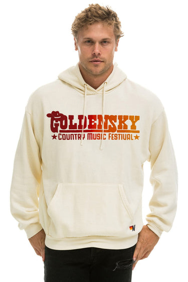 All of our products go through an intense breaking-down process that gives them a vintage feel you'll love because it's broken in from day one of wearing it. You're going to live in this hoodie. Available exclusively at Golden Sky Festival 2024.